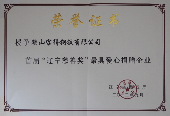2012年9月,公司榮獲首屆“遼寧慈善獎(jiǎng)”最具愛(ài)心捐贈(zèng)企業(yè)。